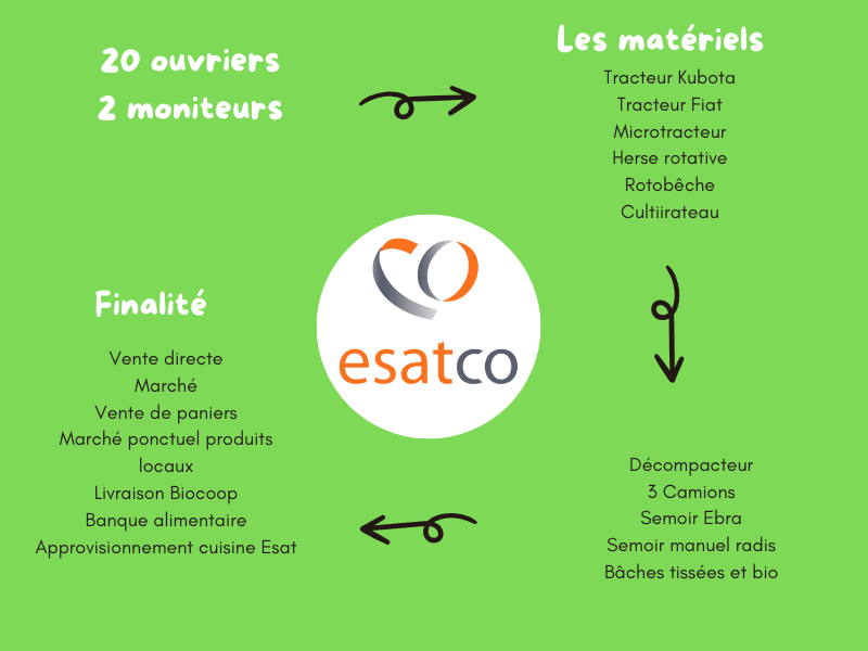 - une équipe d'une vingtaine d'ouvriers en situation de handicap aux parcours très variés, Ils bénéficient tous d'un accompagnement personnalisé. Certains ont pour projet un retour en milieu ordinaire, d'autres se sentent plus en sécurité dans l'environnement protégé que constitue l'Esat.